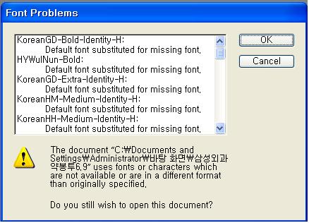 emoticon_096 쿼크 파일 작업시 CID서체들(아시아서체, 윤국민서체 등)을 사용했거나...변형서체(볼드체 등)을 준경우에 에러가 나고 안열리기도 합니다.